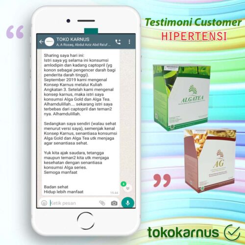 Saya punya penyakit hipertensi dan tahun 1995 pernah opname di Palembang karena Jantung bengkak dan paru-paru hitam. Sejak itu saya terus minum obat untuk hipertensi dan untuk asam urat. Sejak tahun 2015 saya menemukan obat yaitu Alga Gold dan Alga Tea, saya konsumsi 2x sehari, dulu tidak kuat puasa, tiap 3 hari puasa selalu berhenti atau mokel selama beberapa tahun. Setelah minum Alga Gold dan Alga Tea saya kuat puasa selama 1 bulan penuh.